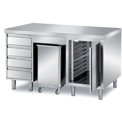 "Tavolo pasticceria composizione n°1, piano h=60mm raggiato su un fronte, n°1 cassettiera a 4 cassetti + tramoggia cpd/1 + elemento portateglie con battente mm 1600x700x850 h" su Ristormarkt - Spedizioni in tutta Italia mezzo Corriere Espresso. Scopri altri prodotti nella categoria: